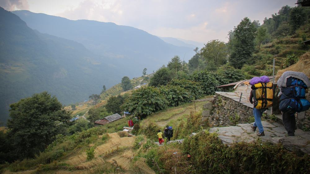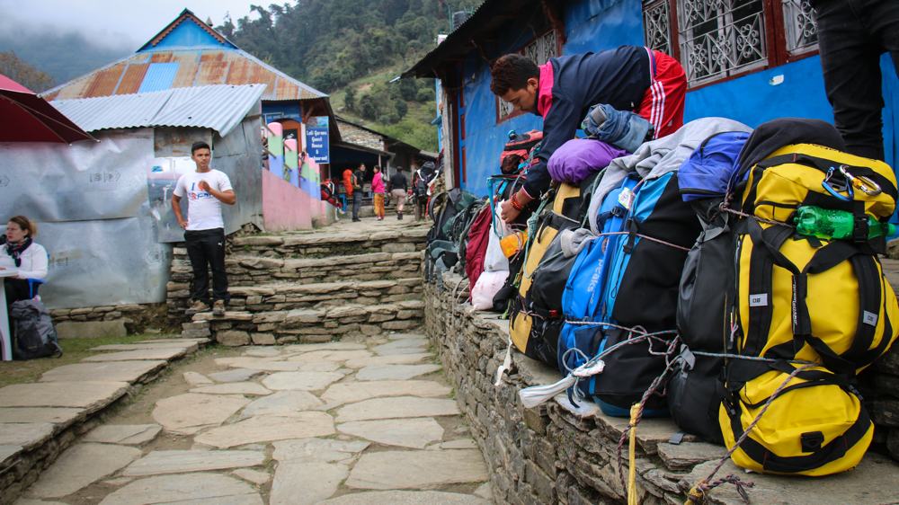 So after using the dry bags for a few years I thought I’d try out their 90 litre Adventure Duffel bag for my upcoming trip to Nepal. I was going on a multi day hike through the Annapurna Mountain range near Pokhara. This would really put the bag to the test. When on the multi-day hike I had my day bag, with all relevant dry bags full of sweeties and such, then a wonderful, stealthy porter will carry your overnight bag, so ideally this needs to be as light and squidgy as possible. He will then tie said bag to another bag, of equal weight, put a rope around his head and off he goes, bouncing up the path in flip flops. The same path you are about to take, but in your expensive walking boots and poles. I don’t think a Nepali has ever used walking poles!