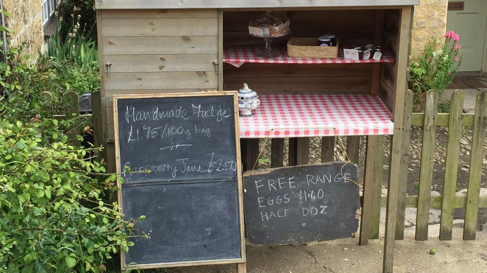 So leaving The Anchor with the sea behind me I headed towards the the Golden Cap caravan park where just to the right is a bridlepath that takes you towards Chideock. I was walking through the wooded bridlepath and I turned round to look at something and nearly jumped out of my skin, as my rucksack was high on my back I thought some one was there! It was lovely to see kerb side produce, homemade fudge, eggs, jam with honesty boxes at the side.
