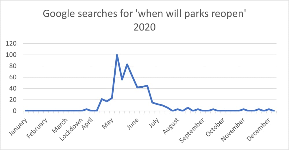 Their work has been even more important in the Covid-era, the spike in searches for ‘when will parks reopen’ tells the story – we all really missed parks!
