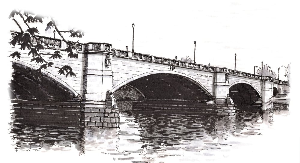 Two medieval parish churches, St Mary’s in Putney and All Saints in Fulham (made infamous by the film The Omen, stand beside the bridge’s abutments, a rare sight along a major river. The first bridge between Fulham and Putney dates back to the Civil War when Parliamentary forces built a bridge of boats in 1642. Later, in 1720, Sir Robert Walpole—who would soon become Britain’s first Prime Minister—was reportedly inspired to build a bridge after being stranded on the Putney side due to an inattentive ferryman.