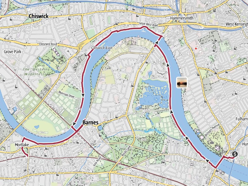 Follow the Thames Path (North Bank) past Craven Cottage, the home of Fulham Football Club. Every day except match days, the path remains at the riverside, past the Crabtree pub and the Michelin-starred River Café.