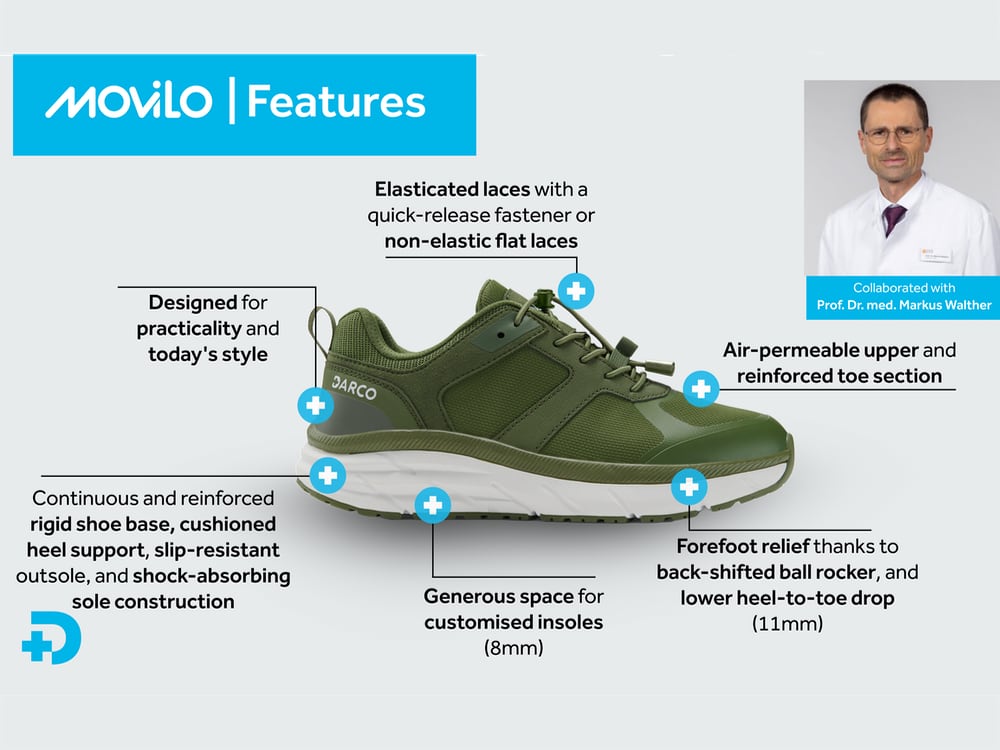 Developed for the recovery and prevention of mild foot conditions such as Metatarsalgia and Hallux Valgus, the Movilo® therapeutic comfort shoe fills a crucial gap in the everyday footwear market. Medically researched and designed in collaboration with renowned foot and ankle specialist Prof. Dr. Markus Walther, Movilo® is a Class 1 medical device that combines therapeutic function with daily wearability and style.