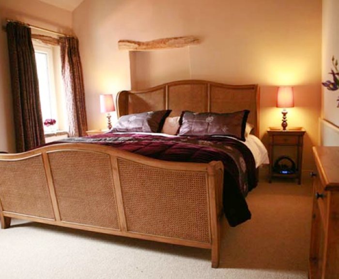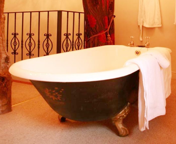 As you go up the solid oak stairs to the two double rooms, you’ll find one ensuite with two single beds or super king size. The other super king room has its own bathroom with Victorian rolltop bath.