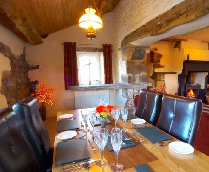 The Honister Green Slate flagged floor leads through to the lounge and around the woodburner where the oak beams and sandstone add a sense of home. Here you can slump into the large, sumptuous sofas. Wander through the stone arch to the dining room; where as you dine; take in the view through the patio doors across the small valley towards the hamlet of Pardshaw.