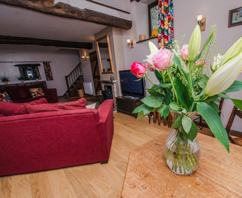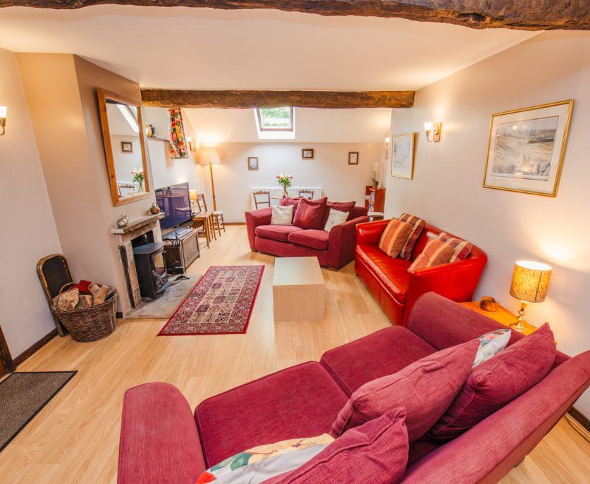 The spacious sitting room has comfortable seating for more than seven and a wood stove giving it a warm and homely feel.