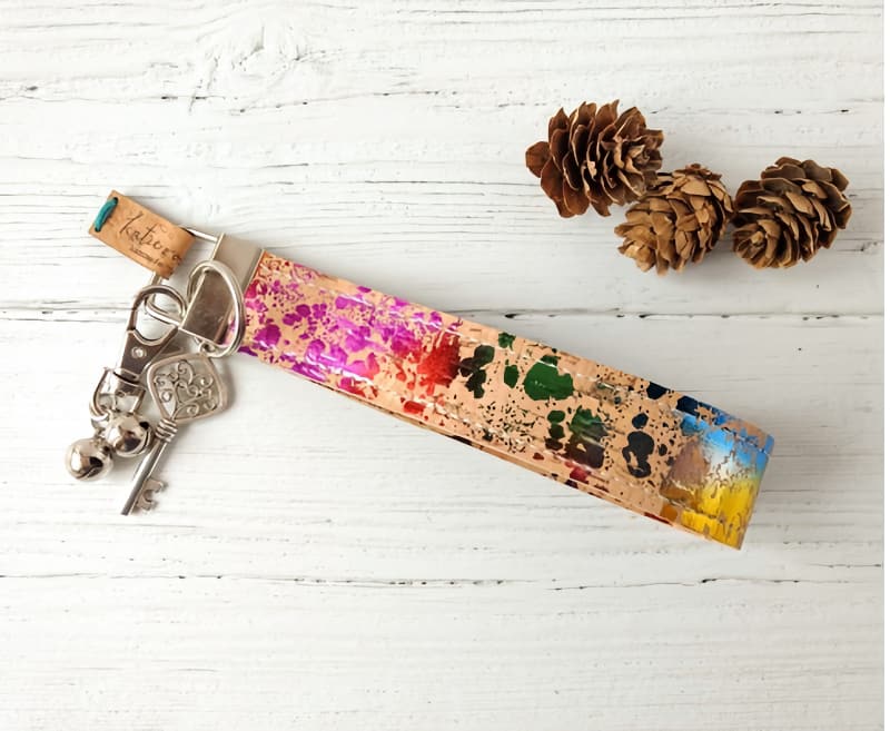 Sustainably-harvested rainbow cork fabric. Metal key fob hardware. Cotton thread.
