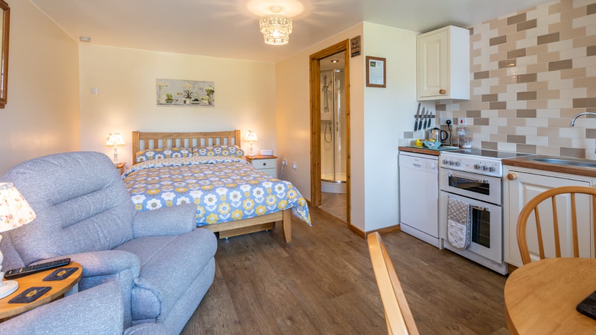 A surprisingly spacious self-catering holiday annexe which is adjacent to the owners’ home, and contains a double bed, shower room, kitchenette and seating area with TV and free Wi-Fi. It has its own fenced garden, and you can bring up to 2 dogs for no extra charge. Off road parking is available.