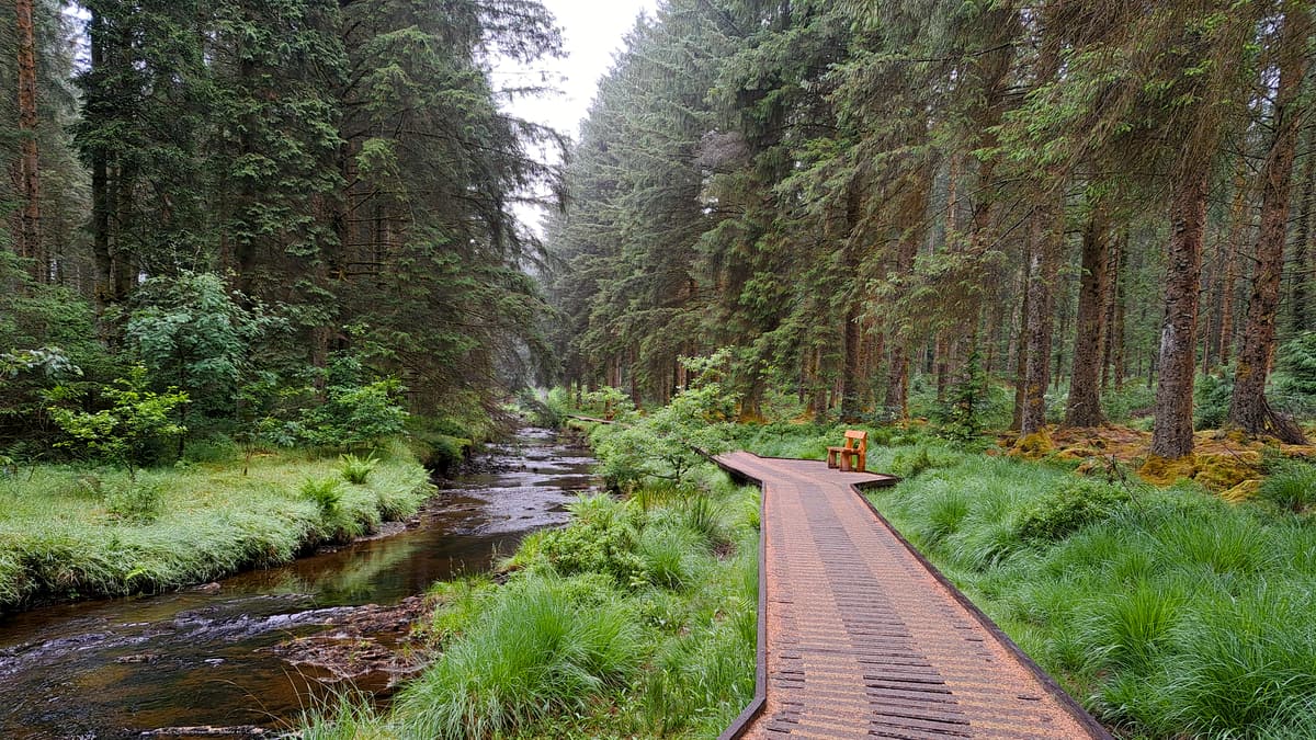 When you’re ready – follow the ‘All Walks’ path downhill to meet the River Severn. Turn right along the boardwalk. Follow the gravel track uphill past the decked seating area, through the mossy woodland full of ferns and foxgloves in season, keeping left at the junction of paths to follow the river on your left. Pass a timber picnic shelter and follow the path round to the right and then cross the ‘Severn Bridge’. The streams here are stained bright orange, a sign of having flowed through copper-bearing strata.