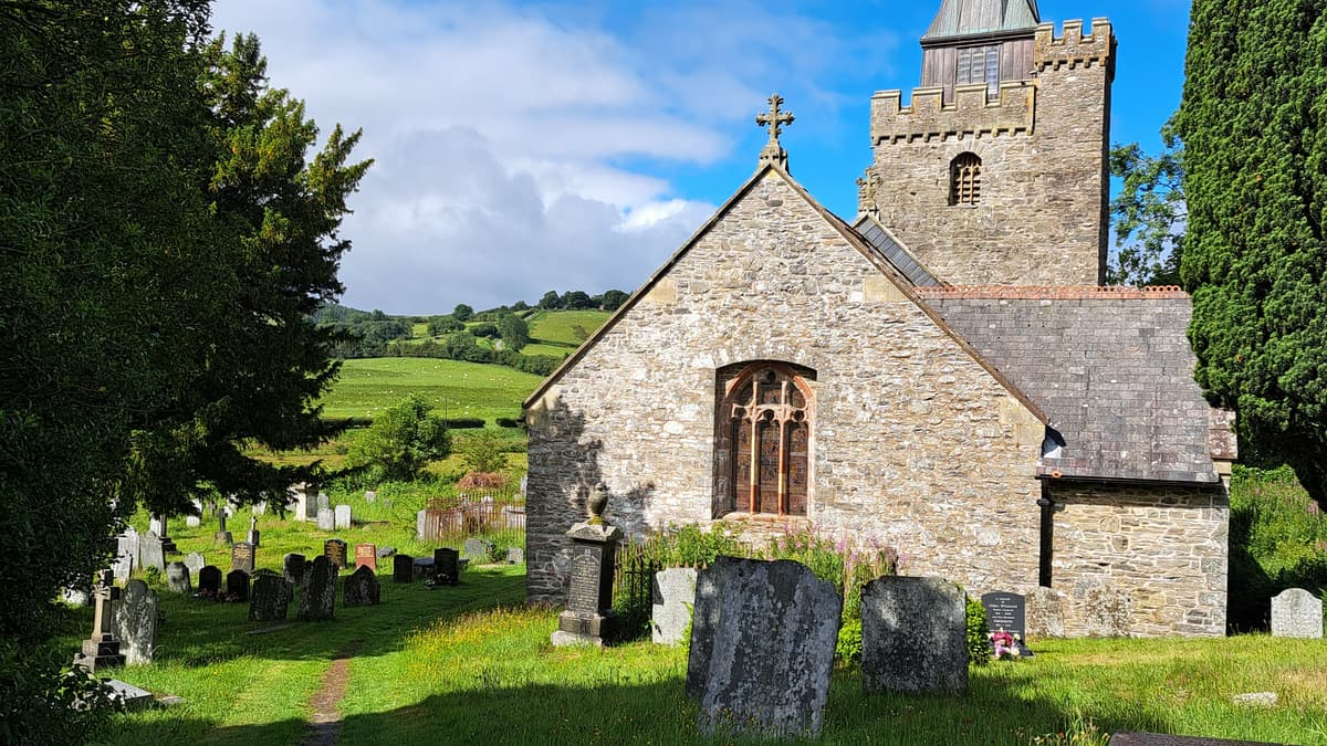 Keep to the left of the bank and fence posts, eventually spotting two telecom towers. Head straight for them as the path descends, goes through a gateway (SN 899 793) and passes to the right of them. Go through a gate into Lywn-gwyn farmyard, around the pond and follow the track round to the right. Turn left onto a tarmac lane heading down to Llangurig, which you can now see in front of you. St Curig’s Church comes into view as you meet the Wye. At the main road, turn left over the bridge for services in Llangurig and to pick up your passport stamp at Llangurig Post Office Stores.