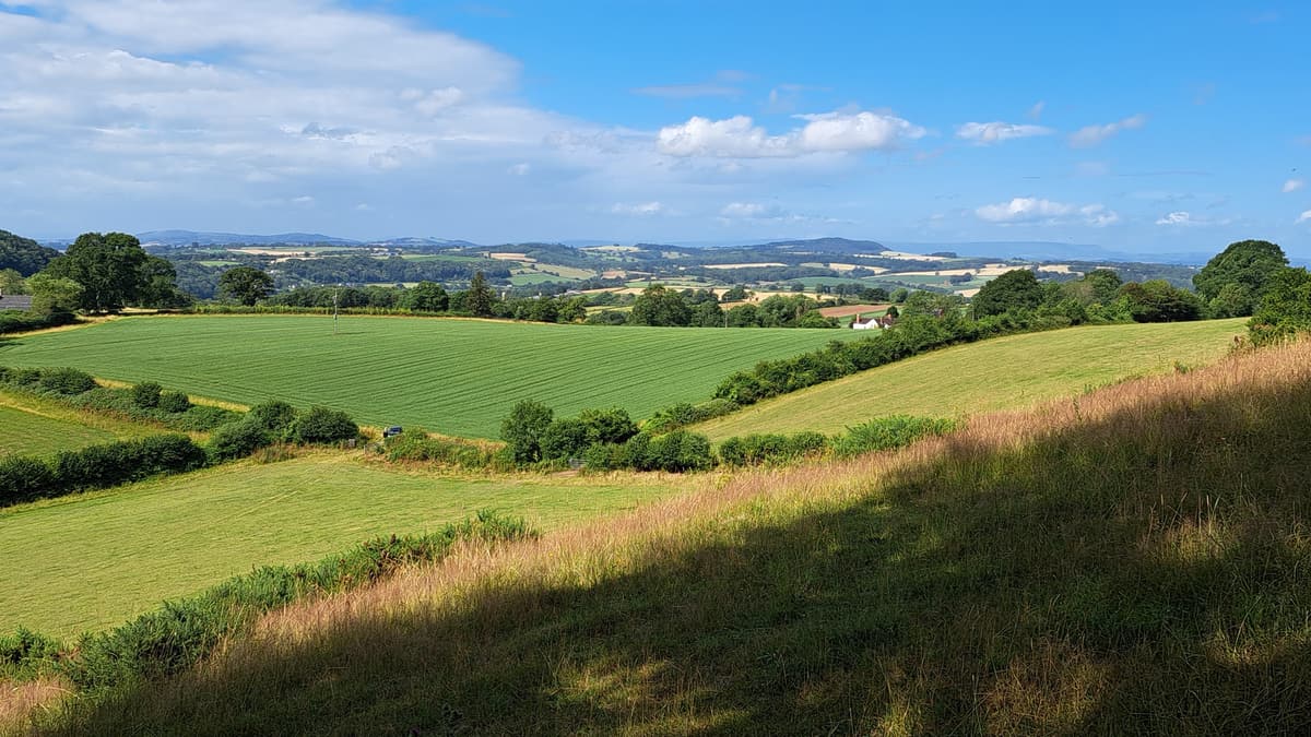 Go through a gate on your left into Capler Wood and then, after a gap in the field hedge, turn left downhill through pine trees to meet a forest track. Turn left and descend towards the road. Turn left, and just after the viewpoint and picnic bench at Caplor Lodge, turn right down a gravel track, through a gateway to pass West Cottage and another group of houses. At the tarmac lane turn right and immediately left down a footpath at Brinkley Hill. Keep to the field edge on the right. At the corner of the field turn left along a track between two fields, ignoring paths to either side. Turn right at the road and at the T -junction keep straight on uphill through the hamlet of Totnor. Turn right at Rose Cottage (where the road bears left) onto a footpath leading down to a gate. Cross the field, going slightly to the right, to a footbridge over a pretty stream, and through a gate into another field. Turn left and walk the length of this very long field, eventually heading to a gate in the far right hand corner. Go through this gate, along a track and through another gate, then passing a house on your left. Walk through the garden down to the road.