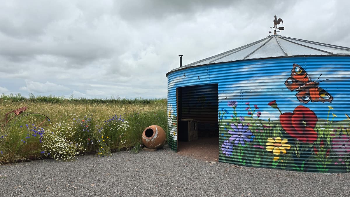 If you wish to visit Townsend Farm turn left towards The Cot and follow the farm track up to the yard. The shop is on the left after the mural. There is also an accessible composting toilet. The Wye Valley Walk follows the left hand field edge, passing to the left of the oak tree. At the end of the field climb up steps to the old railway line.
