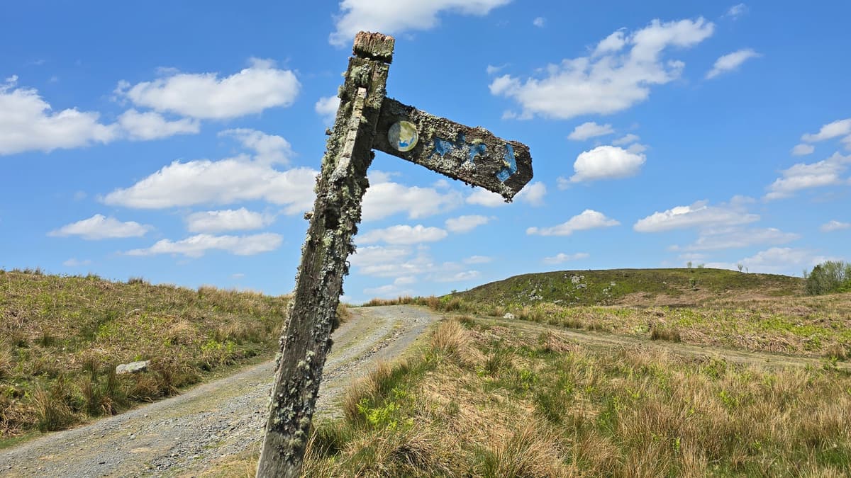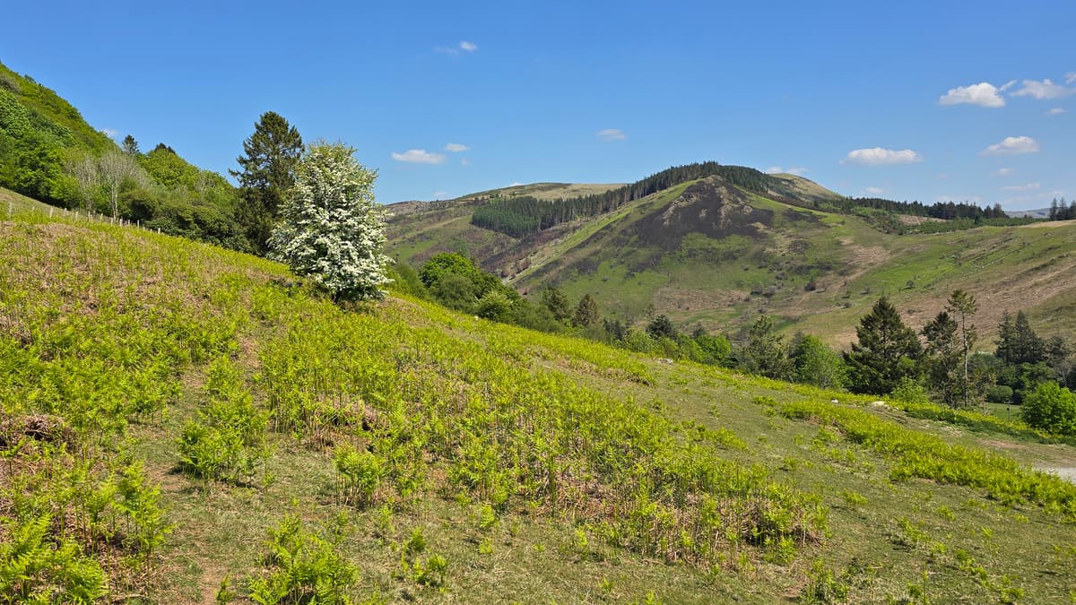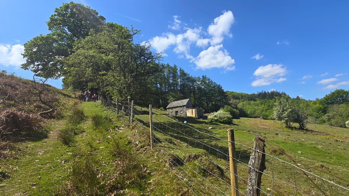 Cross the bridge and turn left, soon you’ll arrive at the junction of the rivers Wye and Marteg, where a well-placed bench makes for a pleasant refreshment stop. Then, when you’re ready, go through a gate and turn right when you reach the lane. Climb uphill and at the first house on the right, Wernnewydd House (SN 964 655), look out for a track on the left leading up to a gate. This can be difficult to spot from the road when summer vegetation is tall – so pay close attention here. Go through the gate and start climbing up a narrow path between two fields. Go through another gate onto open moorland, following a steep climb parallel to the fence on the right, passing a small cottage. Keep on the path, which may be invaded by bracken during summer months, following the woodland boundary to your left and after a while you will spot a small wind turbine higher up the hill. Pass Coed Dolifor, owned by the Woodland Trust, on the right. Soon after the path levels out, passing a waymarker on the right. Continue in the same direction along the field access track, passing by the turbine.