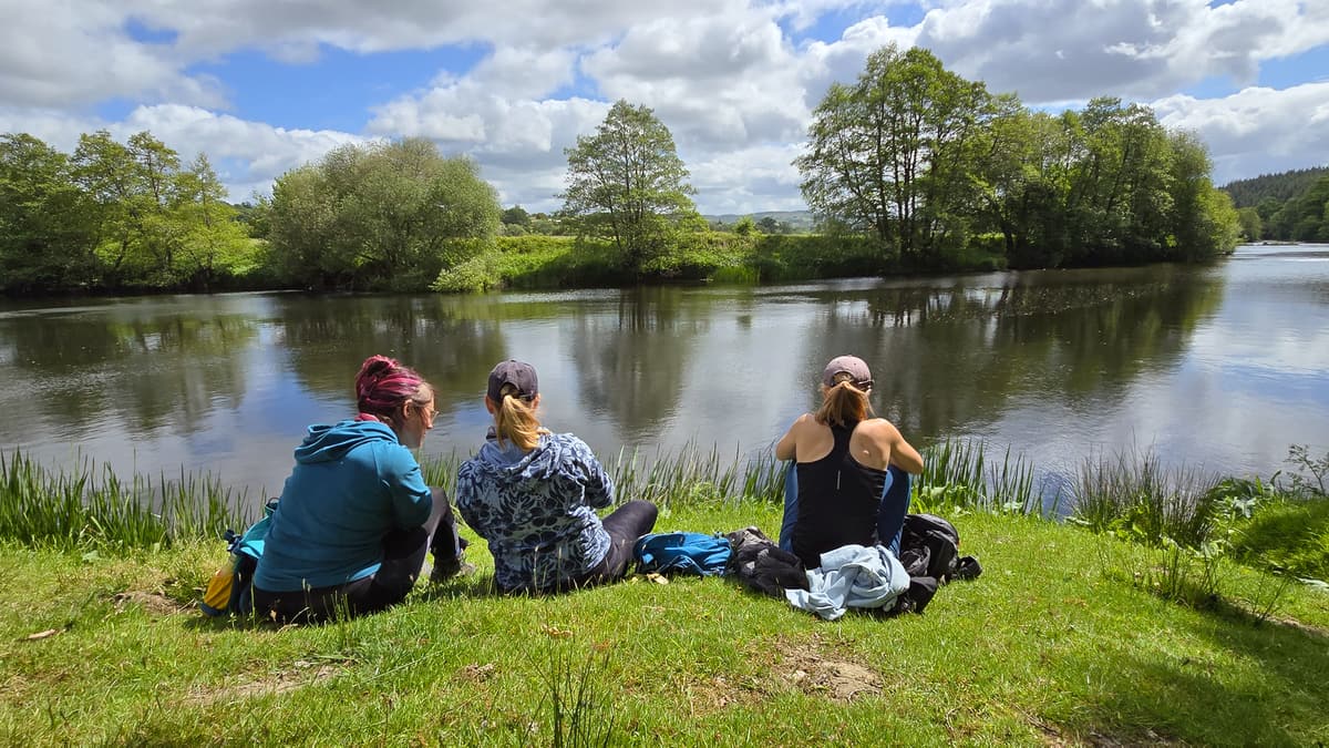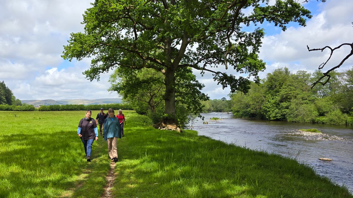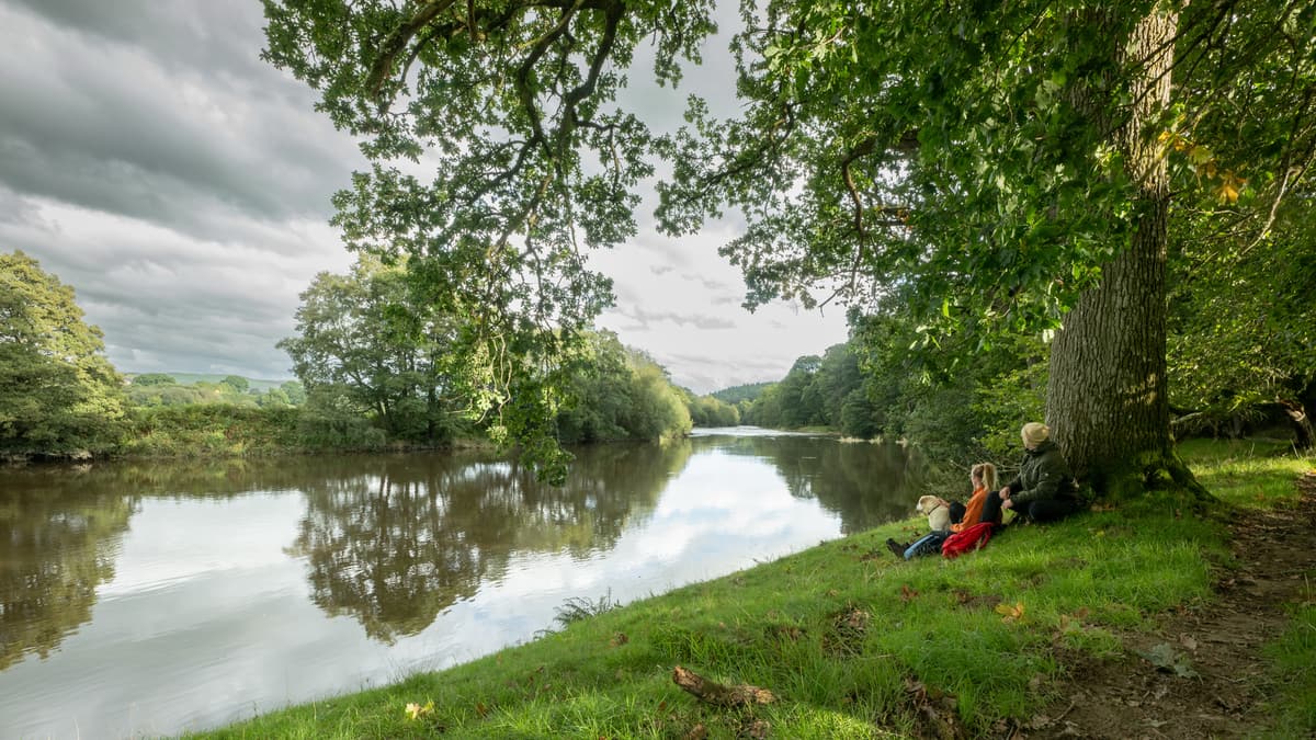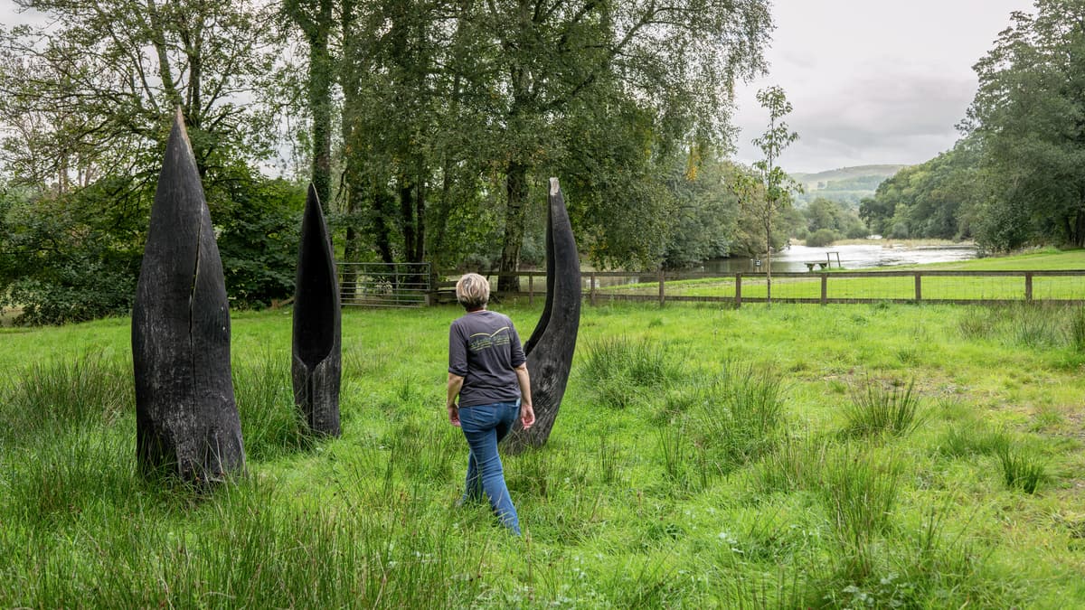 When you’re ready, as the track climbs uphill, keep left staying close to the river on a narrow path. This path will widen and run through gorgeous woodland with the sound of the river rushing over rapids. Eventually, near Plum Tree Pool, you’ll pass three wooden sculptures to your right. Soon after these, you’ll join a minor road that continues beside the river and cross a cattle grid. Turn left immediately through a gate into the field. Keep left to walk through a series of lovely riverside fields and then under the railway bridge.