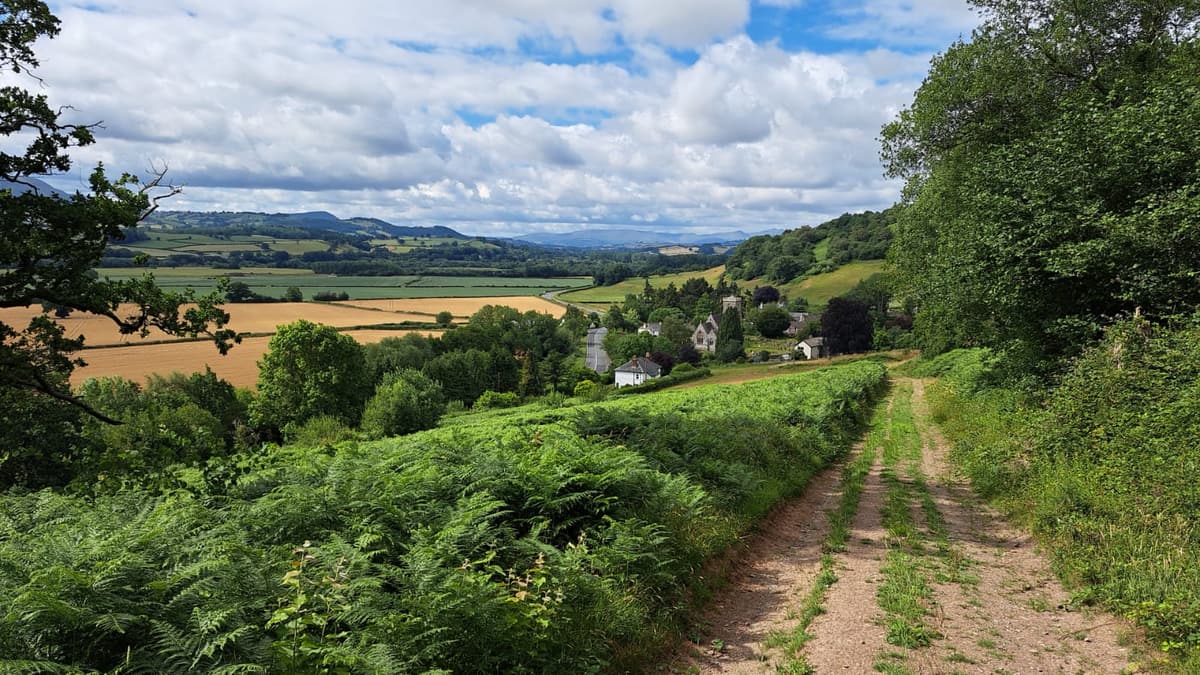 Walk past the church and leave the churchyard through the kissing gate. Cross the lane to take a track to the left up to a gate into the field. Follow the track uphill to the right, leading up to the woods. Here you’ll want to pause for a moment and look back at the amazing views behind you (and take the opportunity to catch your breath!). Go through the gateway and stay on the track climbing to a stile into another field. Cross the stile and follow the hedge on the left. From the top of this field take the opportunity to again admire the view behind you of the Bannau Brycheiniog/Brecon Beacons. Go through the gate and follow the hedge on the left past Briwnant to a gate, with a communication mast visible in the distance. Go through the gate and head straight across the field towards a gate hidden between two trees. Turn right before the gate and follow the hedge downhill to woodland, to go through another gate. Walk diagonally downhill towards the A438, crossing a wet gully. Skirt around the forestry on the left and head very steeply diagonally downhill, heading to the roadside fence beyond the cattle feeder.