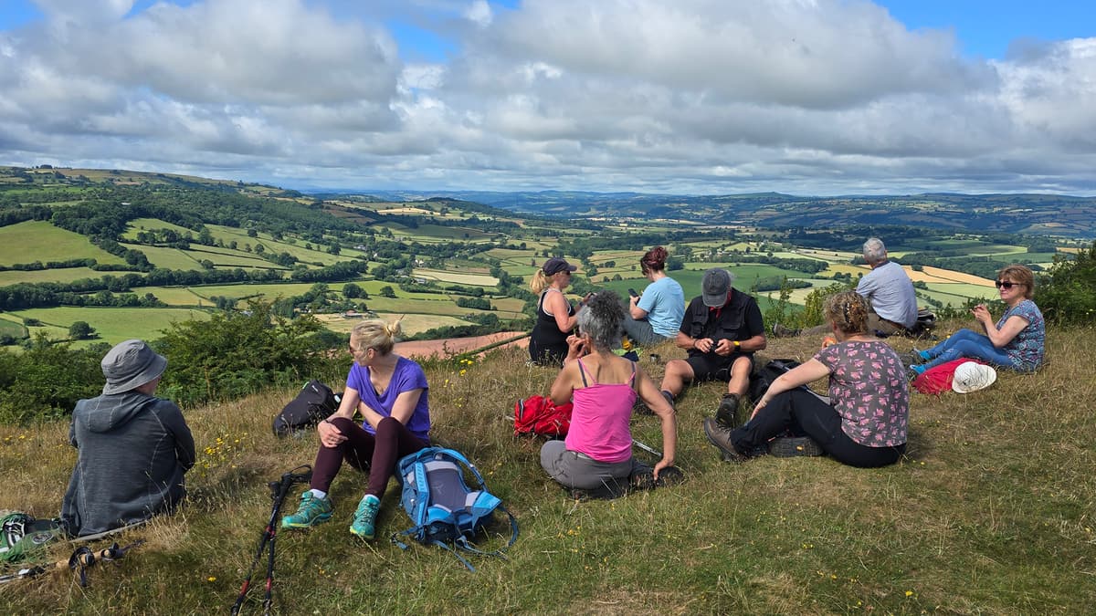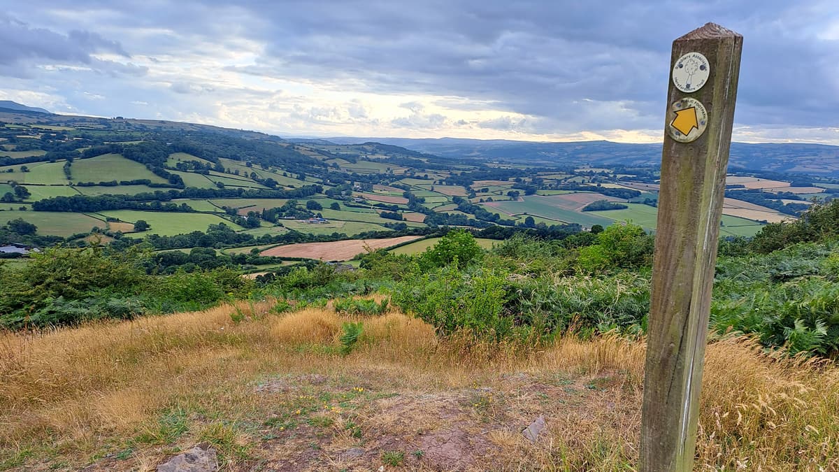 After another uphill section the path flattens out and you turn left at the junction by a Wye Valley Walk marker (SO 304 447), where the Herefordshire Trail continues to the right to the top of Merbach Hill. But it would be a shame to miss the panoramic views from Merbach Hill so it is worth taking a short ‘there and back’ detour here, along the Herefordshire Trail to the trig point, which is to the left when you reach the summit.