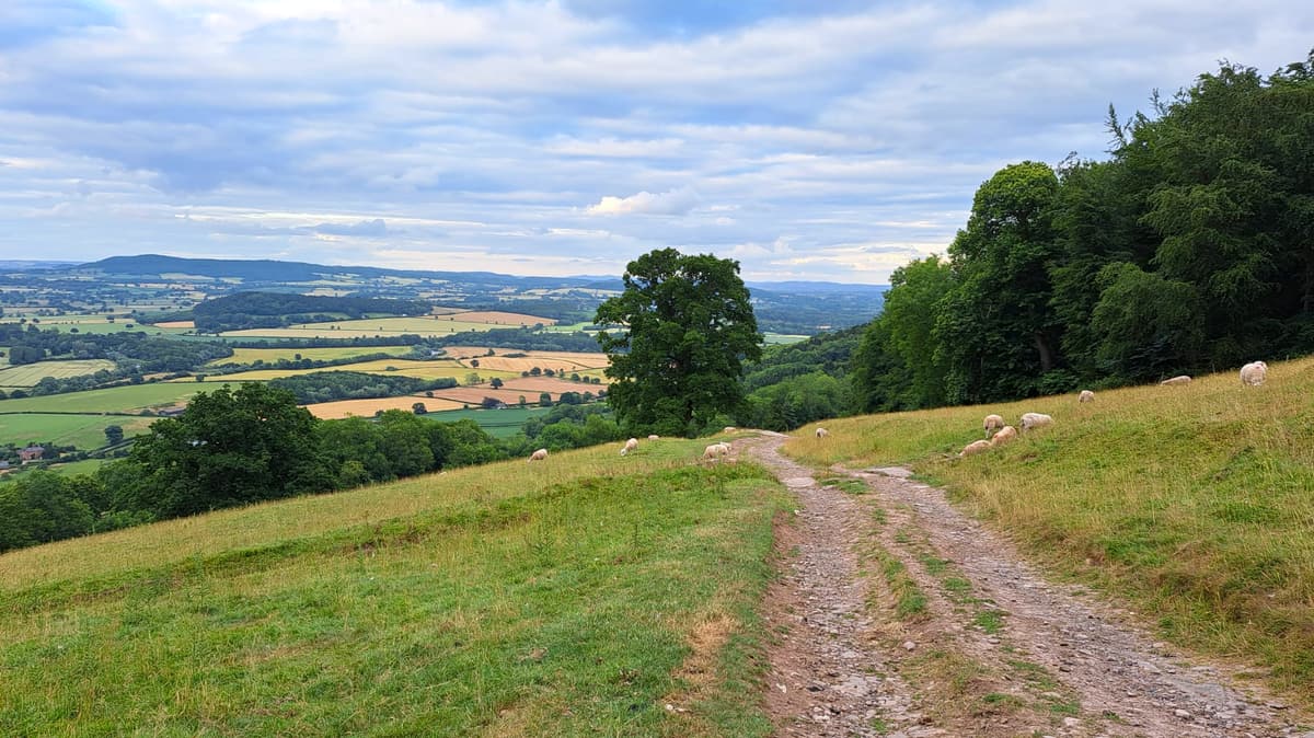Pass through the gate and down to the old railway line. Turn right for a short distance along the embankment to a gate and stile. Go over the stile and continue on the farm track. Soon views to the Wye and the Herefordshire Plain open up ahead of you.