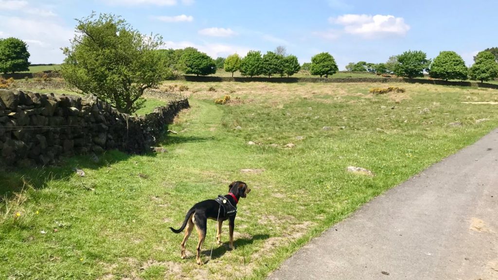 There are three short stretches of road, one of which has no pavement, so you might want to bear this in mind if your dog isn’t great in traffic.