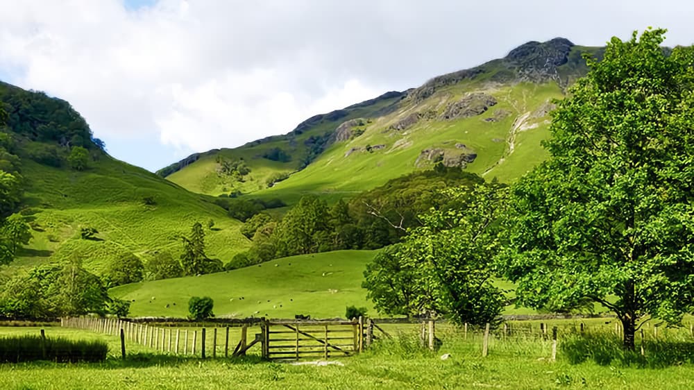Turn right immediately after the bridge, towards Stonethwaite. The excellent level path stays fairly close to the beck, through two farm gates before approaching Stonethwaite. At a junction close to Stonethwaite keep straight on following ‘Grasmere via Greenup Edge’. Go through a gate. Ahead, the great rocky mound of Eagle Crag guards the junction of Greenup Gill with the Langstrath Valley.