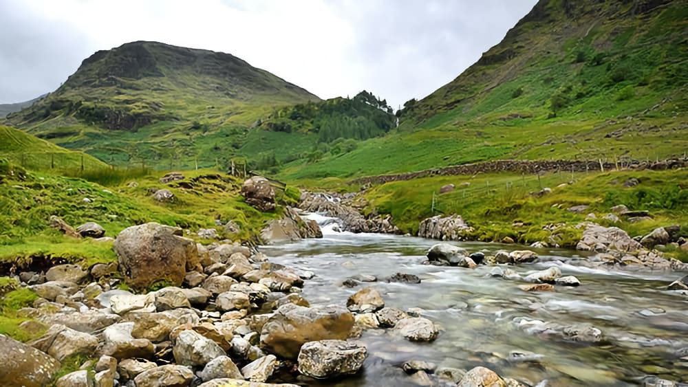 Despite the proximity to these great mountains,this route is a virtually level circuit from which the mountains, the tumbling streams such as Sourmilk Gill and the demanding limitations imposed on farming in the District, can all be viewed and appreciated.
