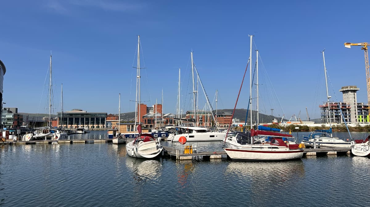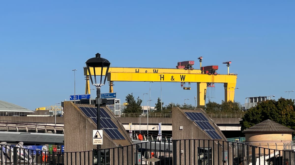Behind us, towards the south, are the towering cranes bearing the initials of H&W – Harland and Wolff. These two are known as Samson and Goliath due to their size. As we look the other way, across the river, we see the summits of Cave Hill, Wolf Hill and Squires Hill to the north, giving the feeling of being surrounded by nature whilst still in a thriving city.