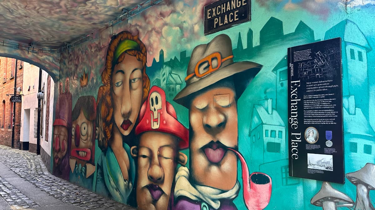 From here we’re heading back into the shopping district once more, along Arthur Street until we get to a crossroads of pedestrian thoroughfares. Here we find the Spirit of Belfast – a public art sculpture by Dan George that was unveiled in 2009. This is a popular spot for buskers – some incredibly talented, some incredibly enthusiastic. We’re turning right here, along Ann Street. To our right is the Victoria Square shopping centre where you can go up into the dome for amazing views if you wish.