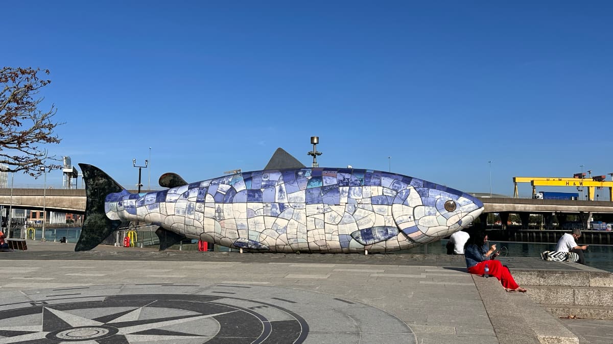 When you’re ready we’re heading west along the banks of the River Lagan, passing the Soundyard (an audible sculpture that gives an essence of the soundscape of this area in years gone by), under the road bridge and along to the footbridge that we take across to the opposite side of the river. Here we find Bigfish – a 32ft printed ceramic mosaic sculpture that was constructed in 1999. It signifies the regeneration of the River Lagan. Look closely at the tiles – they tell the story of the city.