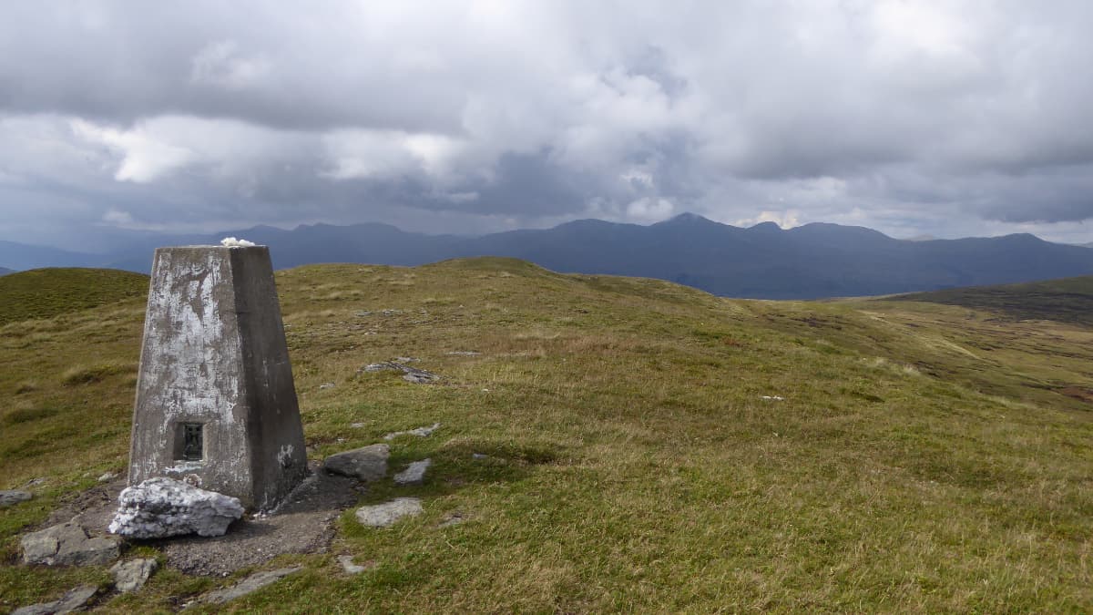 There is a faint path that leads us up a ridge towards the summit, which is marked by a trig point. The views are dominated by the Ben Lawers range to the north, with Ben Lui, Ben More and Stob Binnein and Ben Vorlich all well seen on a good day.