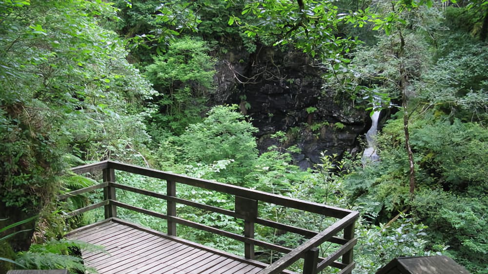Along this stretch of the walk we get a good view of the Deil’s Cauldron itself – where the river Lednock emerges from a rock-walled gorge in a double cascade into a wide pool.