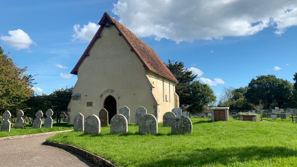 Our route takes a right turn off the path and up into the churchyard of St Wilfrids of Church Norton. Please note – you will need to climb over a low wall to get into the churchyard. Church Norton owed its importance to St Wilfrid – the brave northern bishop who attempted to introduce Christianity into pagan Sussex in the 8th century.
