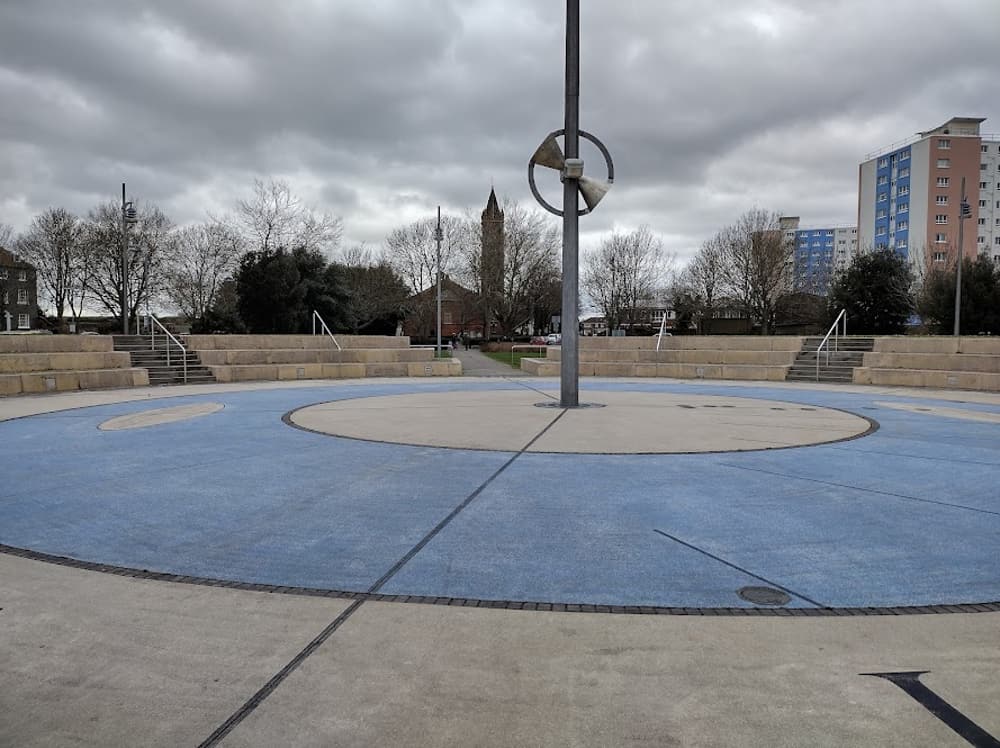 1) Gosport Ferry used to be a chain-linked ferry and floating bridge, which also served as a defence.The Timespace was inspired by Albert Einstein’s theory of relativity and his time space cone diagram. The location of the Timespace is on both a physical and spiritual line from Holy Trinity Church in Gosport to Portsmouth Harbour. The central mast serves as a sundial, casting a shadow on the ground, and around the perimeter is a paved mosaic, which depicts events and characters from Gosport’s maritime past.