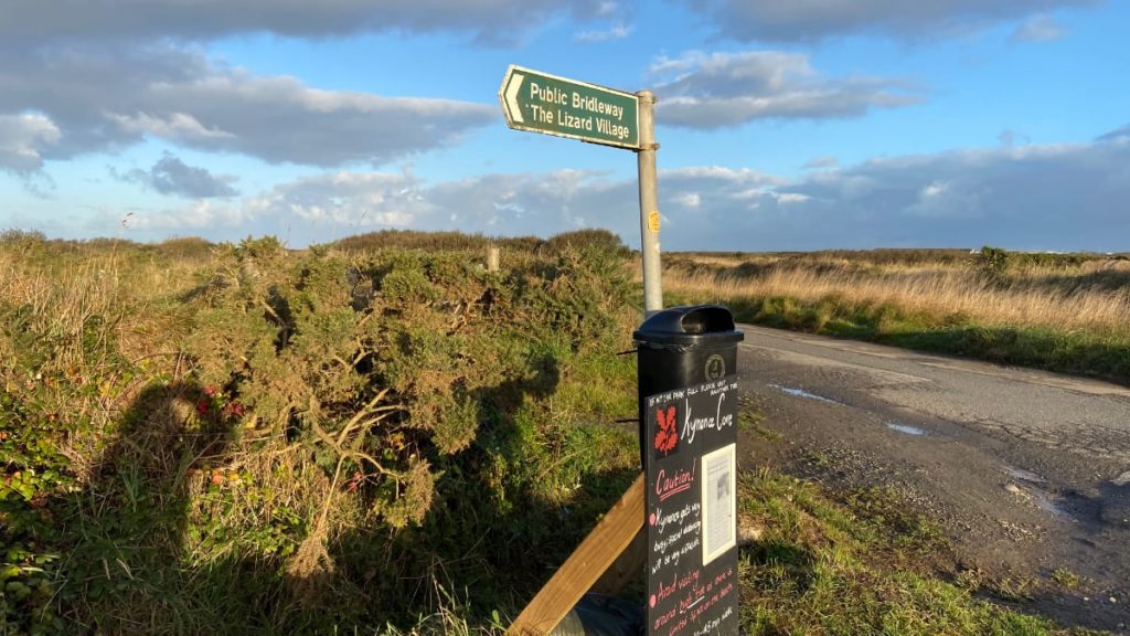 Follow the bridleway until you reach the road. Turn Left. This road leads down to the National Trust Carpark at Kynance Cove.
