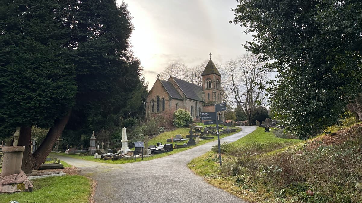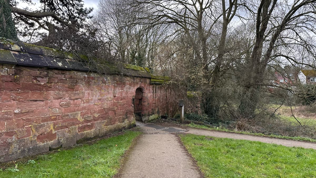 When you’re ready, we’re heading down towards the car park, crossing over the river where on the opposite side you’ll see a great playground for children to enjoy. On the right here is the pedestrian entrance to All Saints C of E Primary School. As we reach the main road, London Road, care should be taken as this is a very busy road. We’re going to use the pedestrian crossing as we’re headed through the stone arch on the opposite side and into the cemetery.