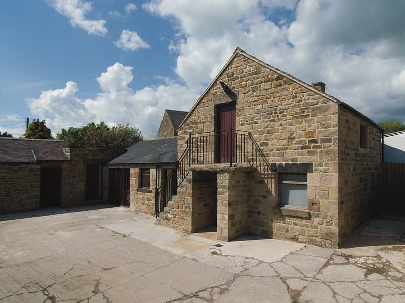 Proceed up towards the farm. Go through a waymarked farm gate and turn right to pass in front of the buildings to another field gate. Bear left to yet another (yellow marked) field gate. Go through it and keep a fairly straight line about 30 yards below a fence to a stile, then cross 2 more fields towards an isolated agricultural building in the left corner. Go through the gate, with post beyond, and walk up the lane, strewn with stones from both side walls, through a metal, then wooden, gate up to the substantial stone Woodhouses Farm.